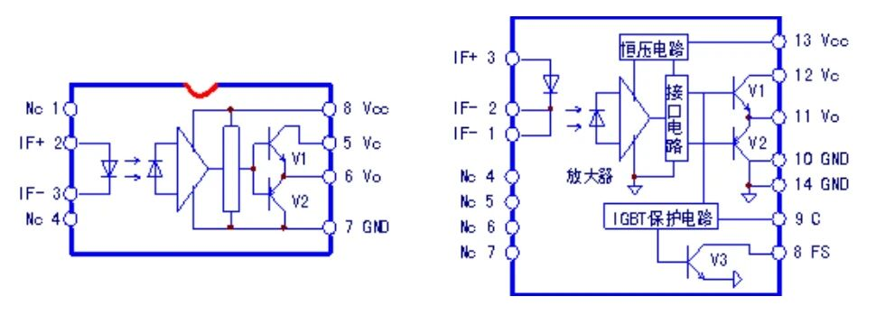 PC923的相關(guān)參數(shù):輸入IF電流5∽20mA,電源電壓15∽35V,輸出峰值電流±0.4A,隔離電壓5000V,開通/關(guān)斷時間0.5μs。可直接驅(qū)動50A/1200V以下的IGBT模塊。PC923的電路結(jié)構(gòu)同TLP250等相近,但輸出引腳不一樣。5、8腳之間可接入限流電阻,限制輸出電流以保護(hù)內(nèi)部V1、V2三極管。常規(guī)應(yīng)用,是將5、8腳短接,接入供電電源的正極。如果將輸出側(cè)引線改動一下,也可以與TLP520、3120等互為代換。