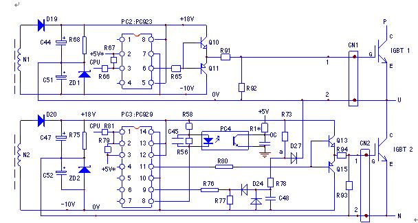 PC929驅(qū)動IC是兼有對驅(qū)動脈沖隔離放大和模塊故障檢測雙重“身份”的。由CPU主板來的脈沖信號從1/2、3腳輸入到PC929內(nèi)部的光電耦合器,從11腳輸出后,經(jīng)Q13、Q15兩級互補(bǔ)式電壓跟隨器的功率放大后,引入IGBT2的G極。此為驅(qū)動脈沖的信號傳輸電路路;?PC929的9腳為模塊故障檢測信號輸入腳。正常工作狀態(tài)下,PC929的11腳輸出正的激勵脈沖電壓,使Q13導(dǎo)通,Q15截止。Q13的導(dǎo)通,將正偏壓加到IGBT2的G極上,IGBT2進(jìn)入飽合開通狀態(tài)。忽略IGBT導(dǎo)通管壓降的話,IGBT2的導(dǎo)通即將U輸出端與負(fù)直流供電端N短接起來,提供輸出交流電壓的負(fù)半波通路,在導(dǎo)通期間,只要變頻器是在額定電流以內(nèi)運(yùn)行,IGBT2的正常管壓降應(yīng)在3V以下。